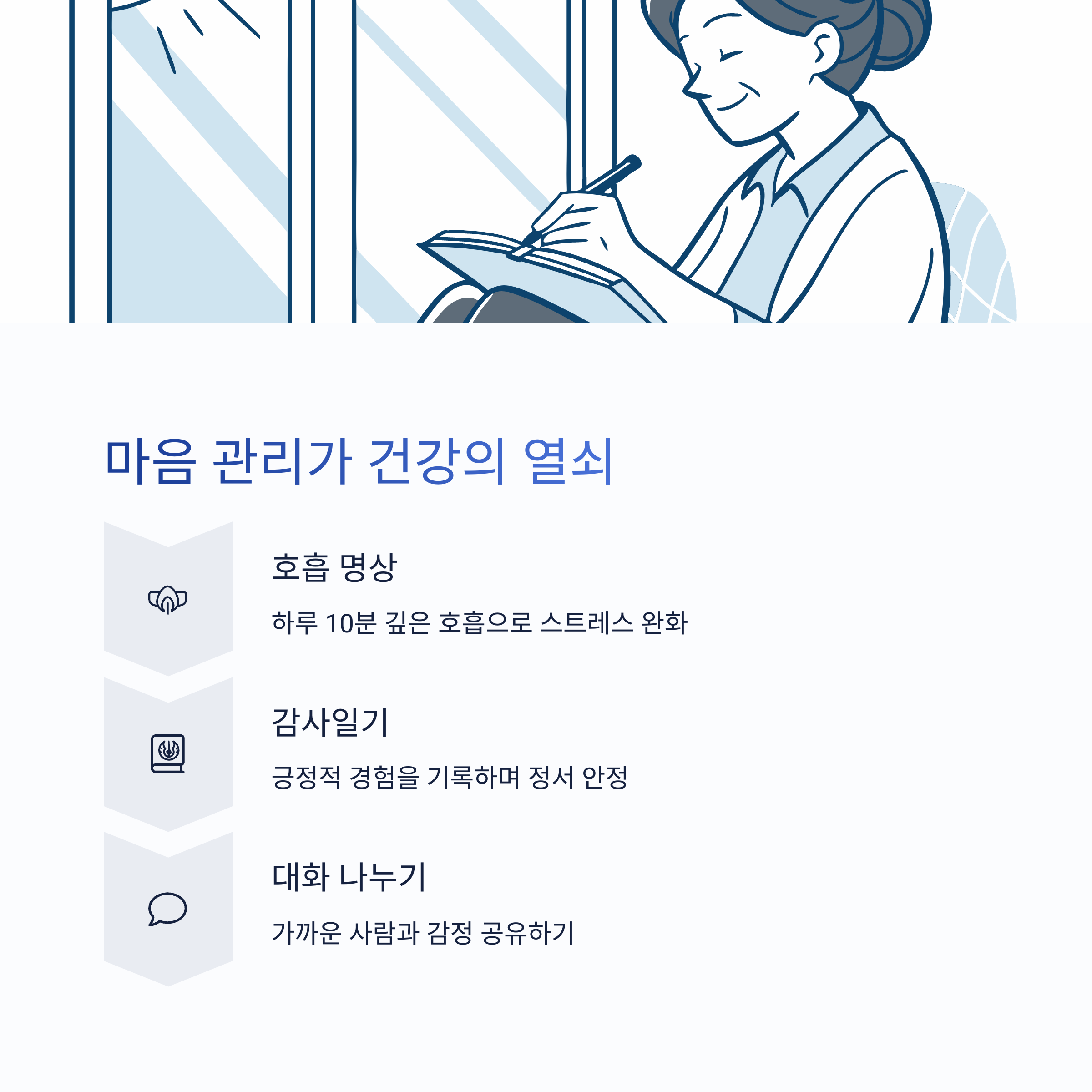 하루 10분간의 호흡 명상, 감사일기 쓰기, 그리고 가까운 사람과의 대화가 큰 도움이 됩니다.