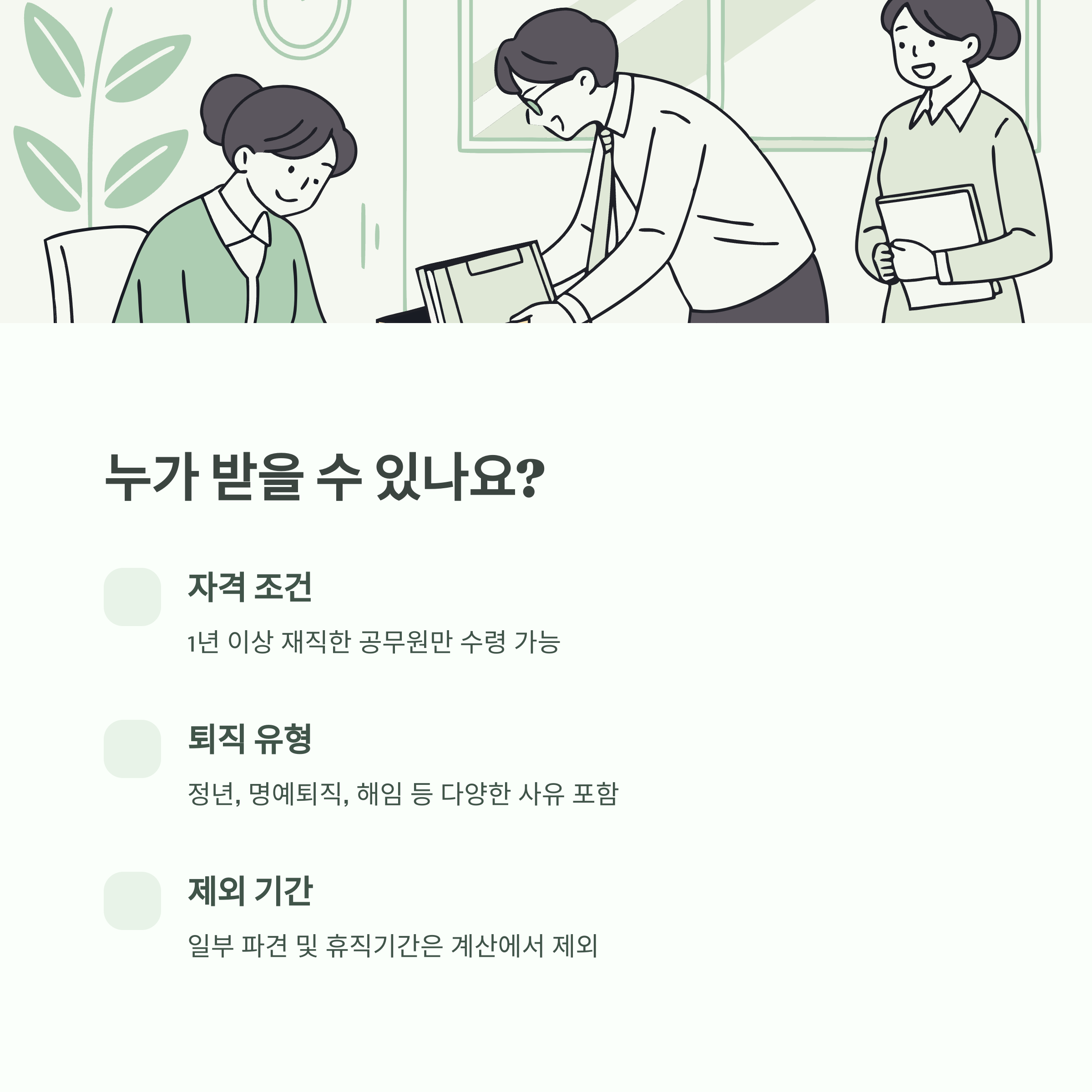 - 20년 미만 근무자: 퇴직 일시금 지급
