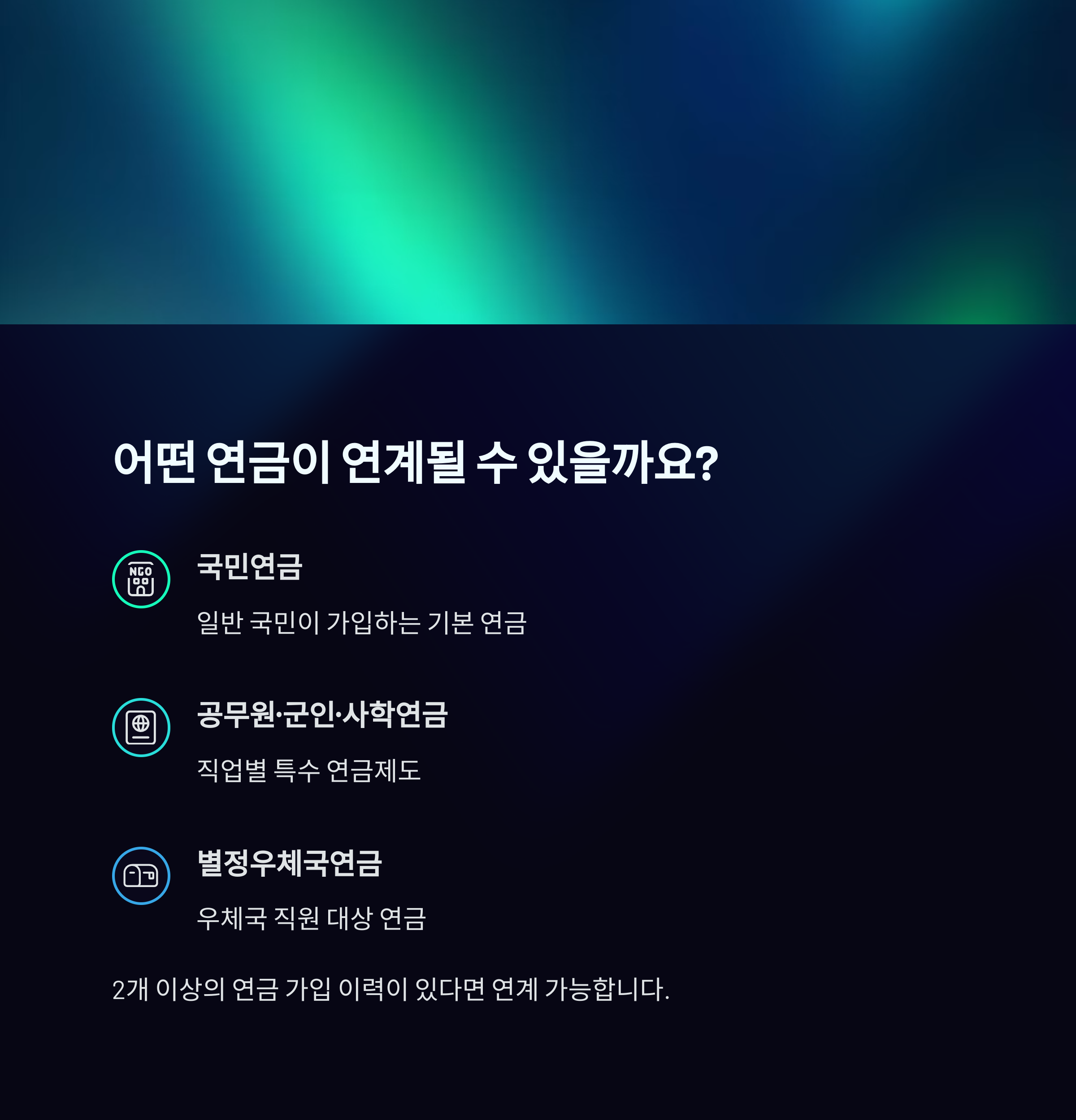 국민연금, 공무원연금, 군인연금, 사학연금 등 다수 가입 이력이 있는 경우 활용됩니다.