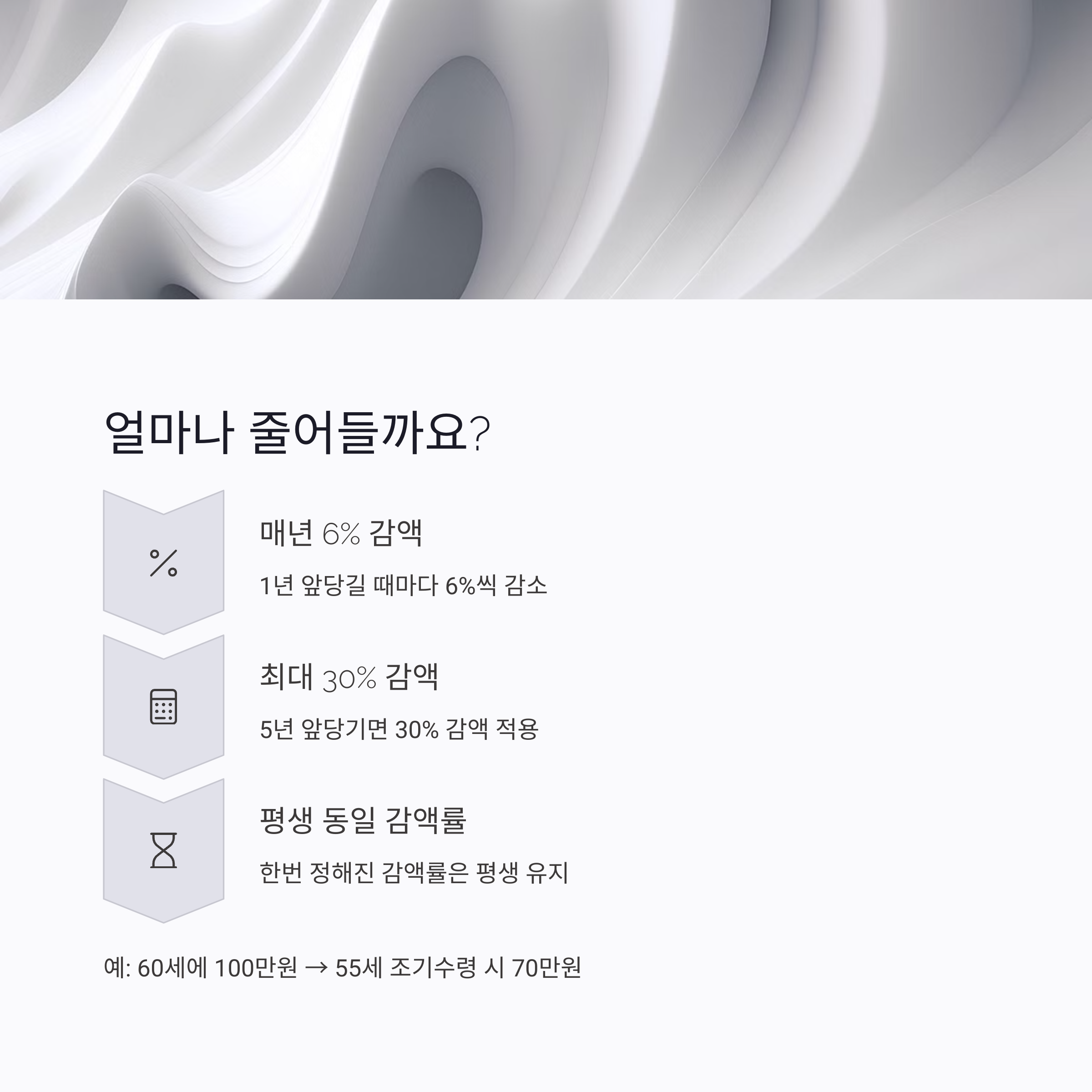 단, 수령 시기를 앞당기는 만큼 연금액은 평생 감액된다는 점이 가장 큰 특징입니다.