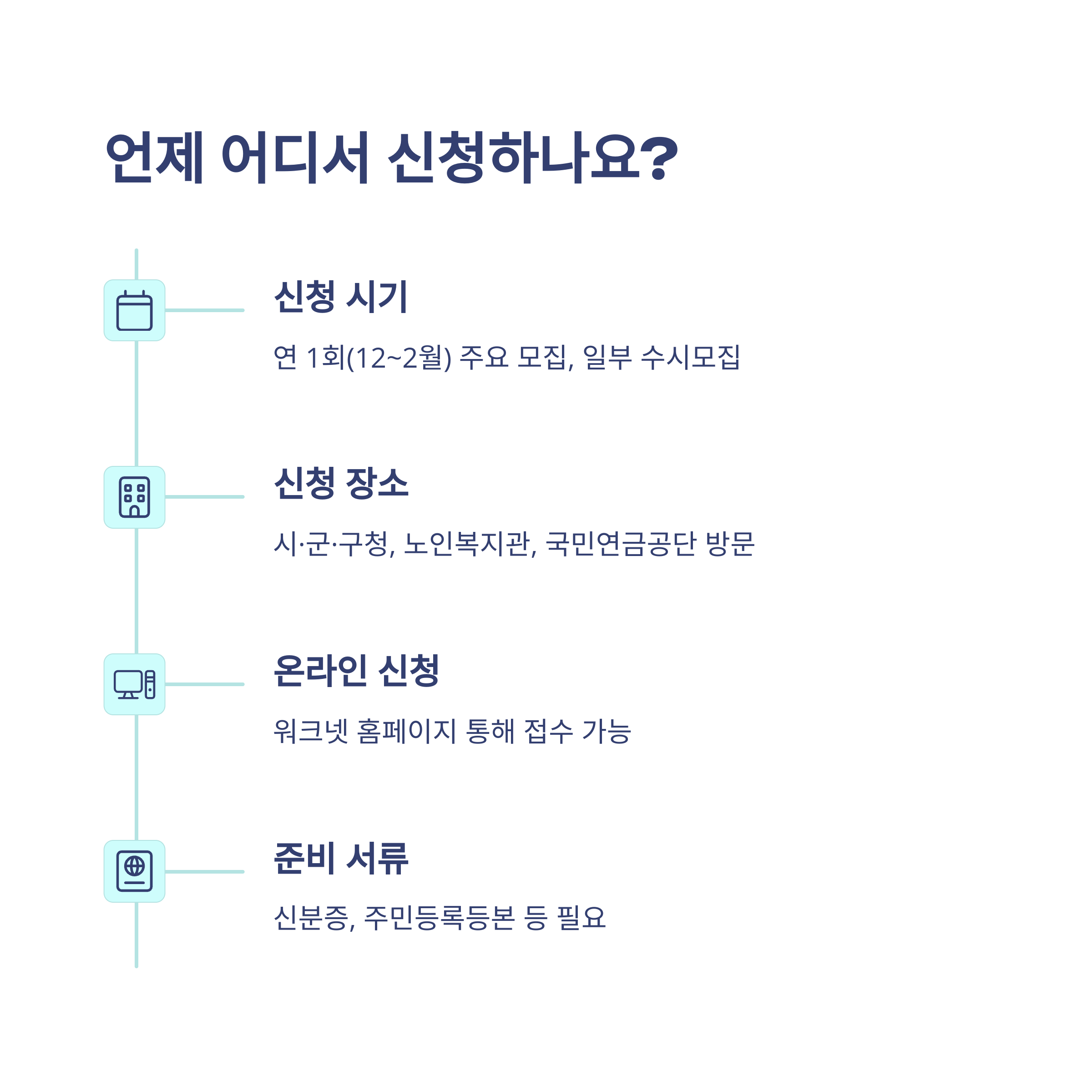 신청은 가까운 **노인일자리 수행기관(시니어클럽, 복지관 등)**을 방문하거나
