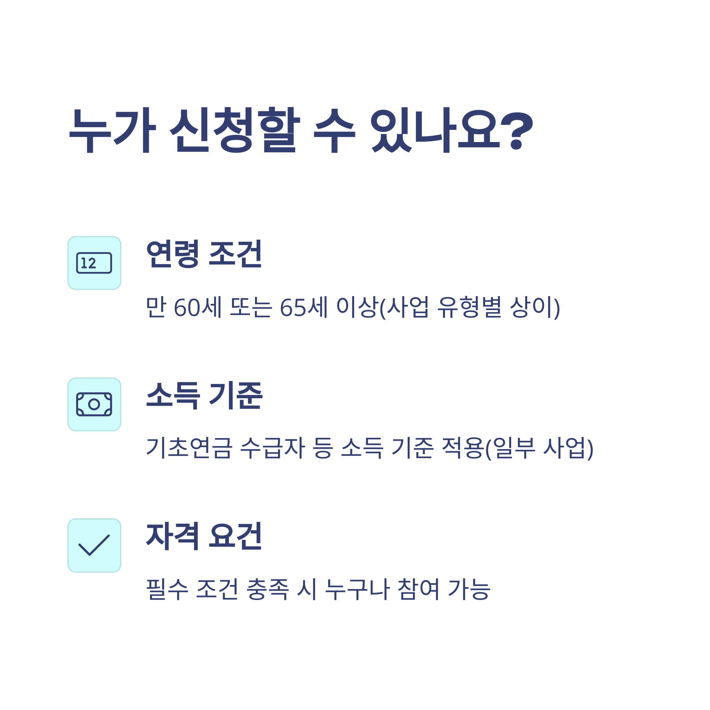 첫째, 만 60세 이상 기초연금 수급 대상자 또는 해당 연령 이상의 국민이라면 신청 가능합니다.