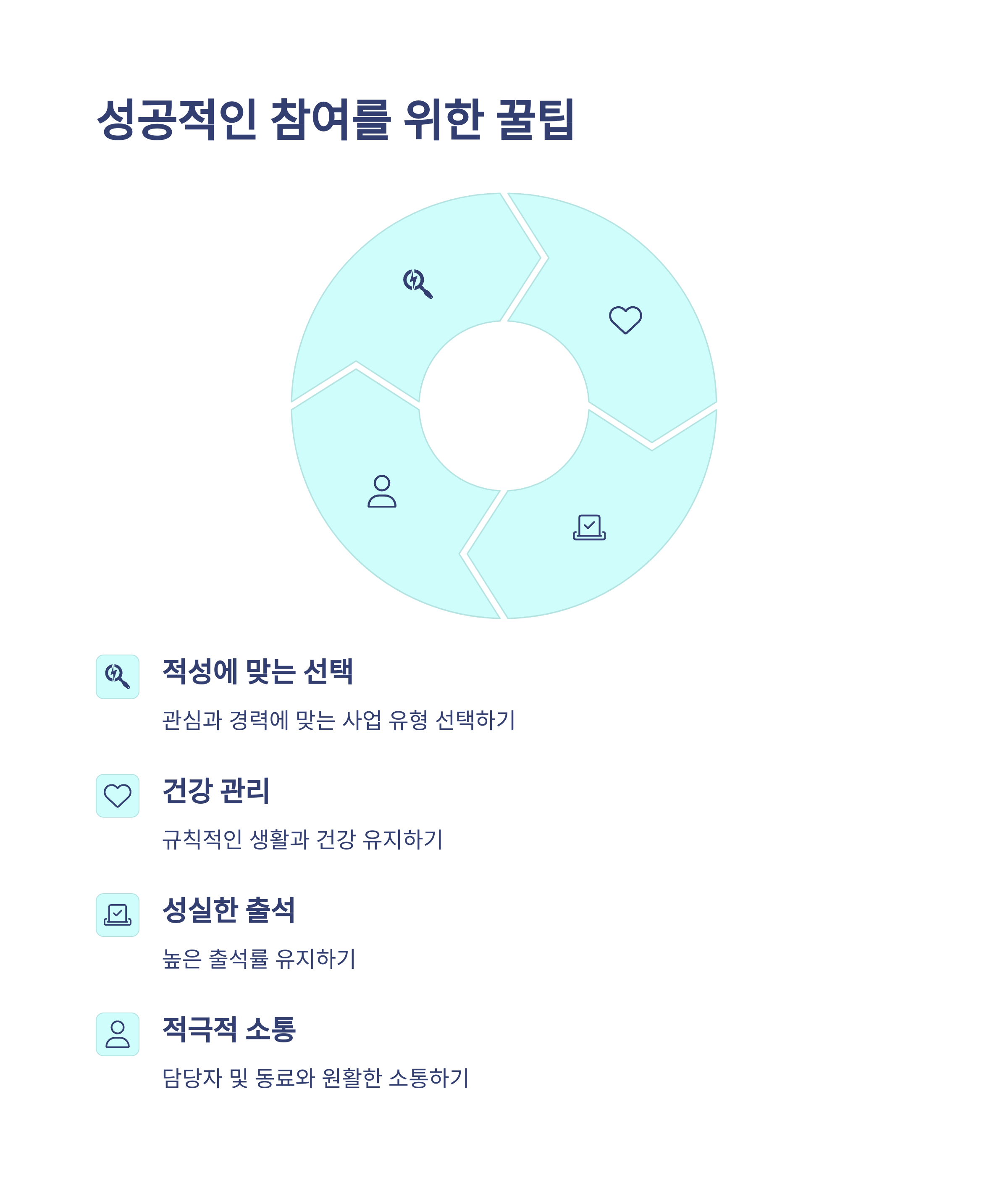 둘째, 건강상 근로에 무리가 없고, 참여 중 타 일자리와 중복되지 않아야 합니다.