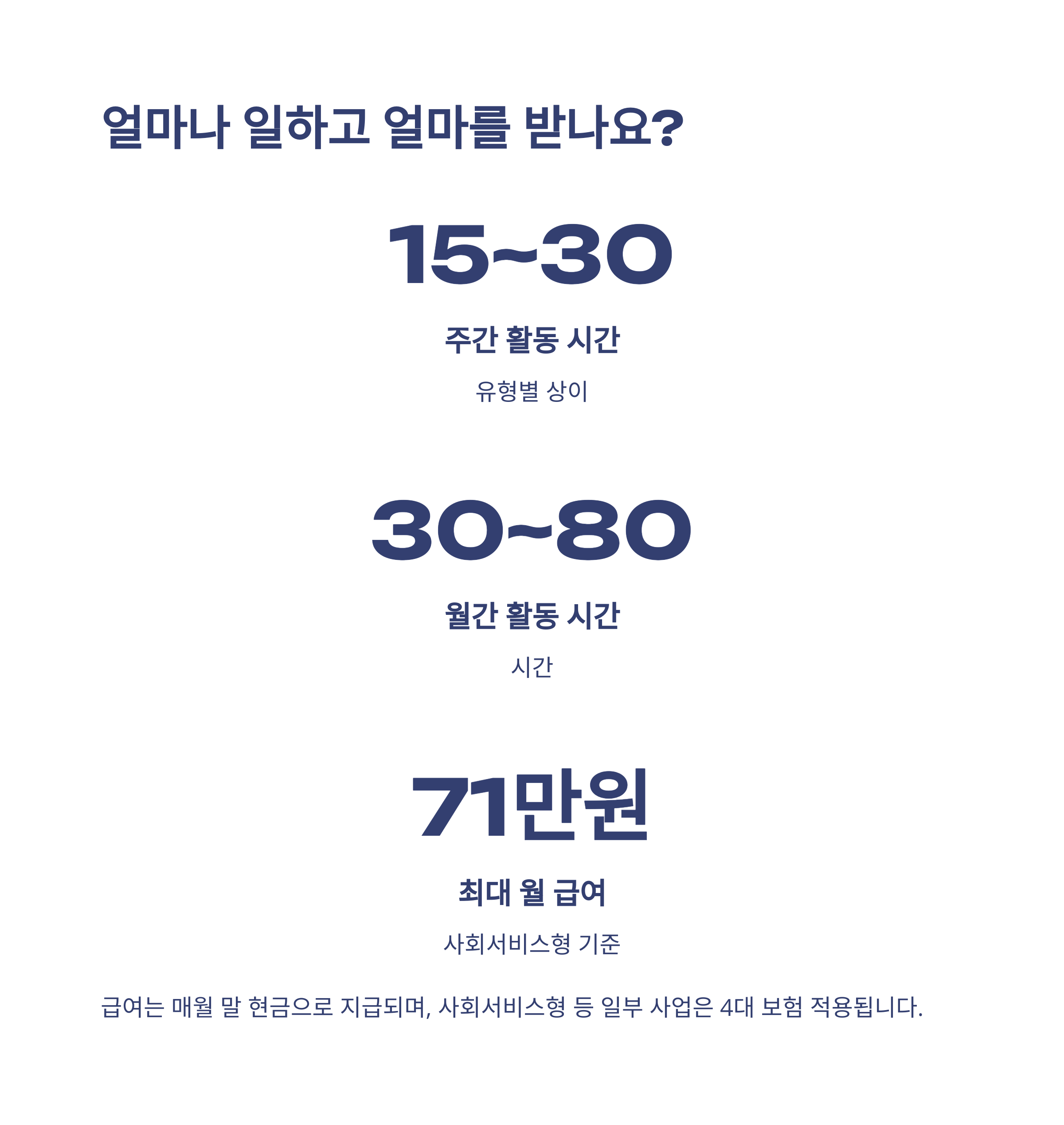 사회서비스형은 월 60~80시간 근무 기준으로 최저임금 수준의 보수가 제공됩니다.