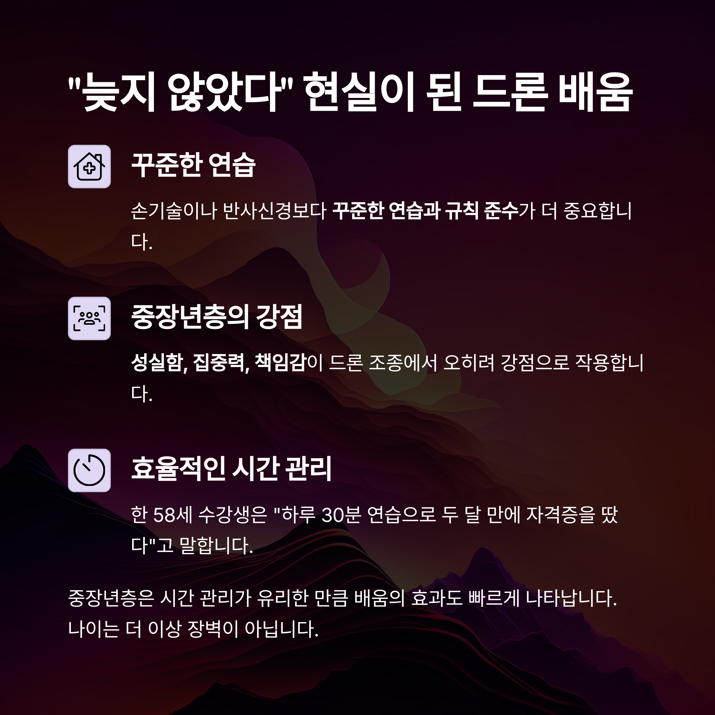 드론은 연령을 가리지 않는 기술이며, 꾸준한 훈련으로 충분히 습득 가능합니다.