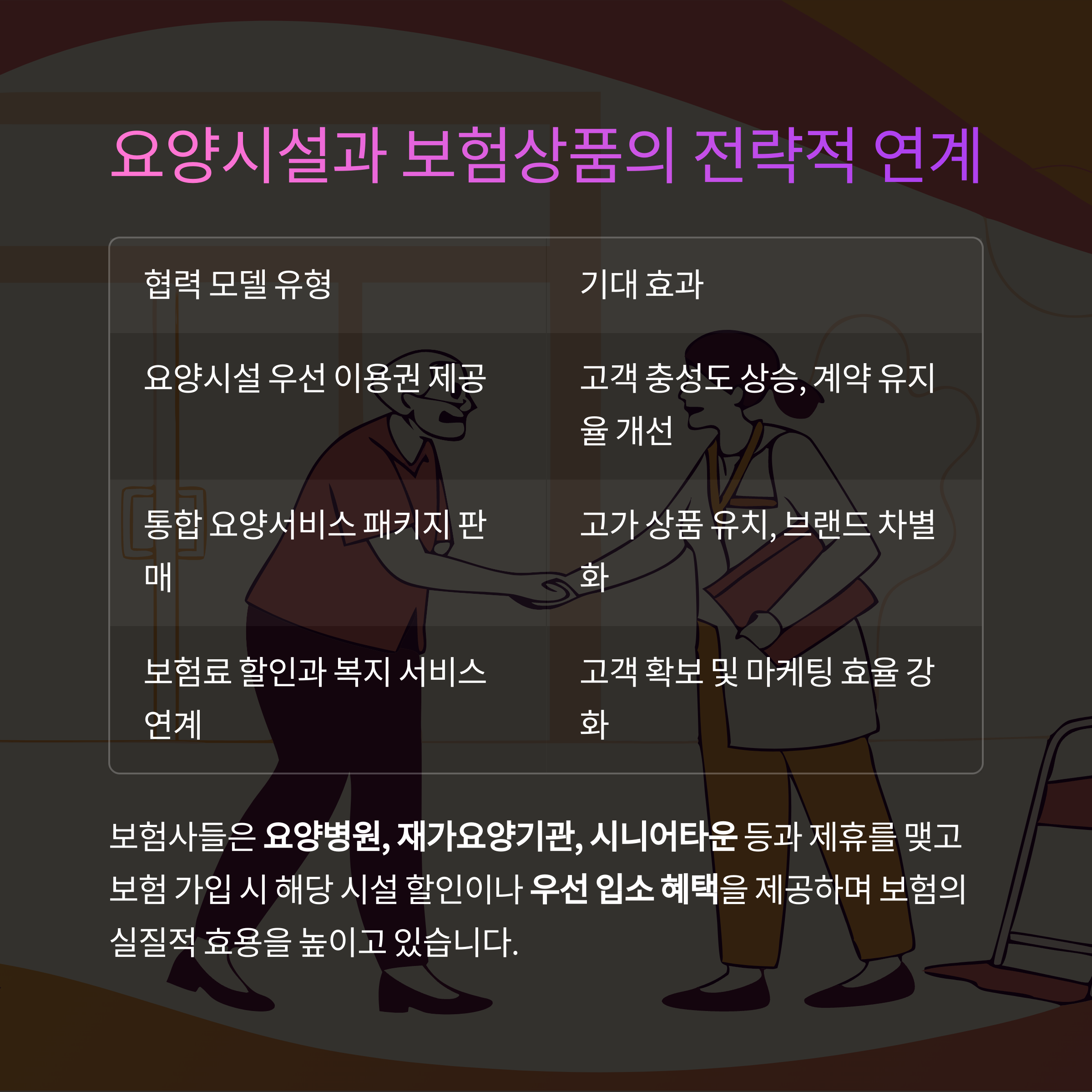 보험 가입 시 해당 시설 할인이나 우선 입소 혜택을 제공하며 보험의 실질적 효용을 높입니다.