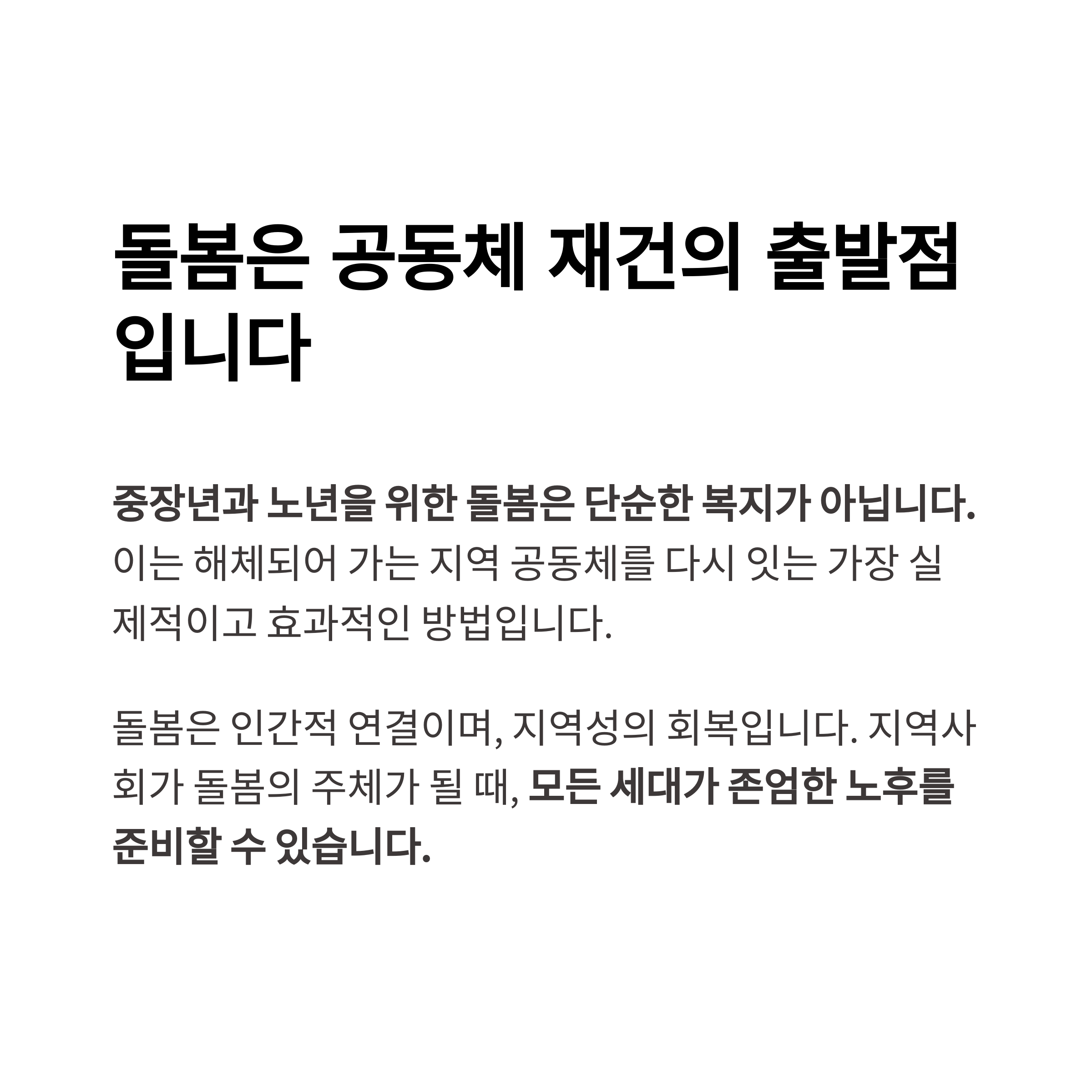 지역사회가 돌봄의 주체가 될 때, 모든 세대가 존엄한 노후를 준비할 수 있습니다.