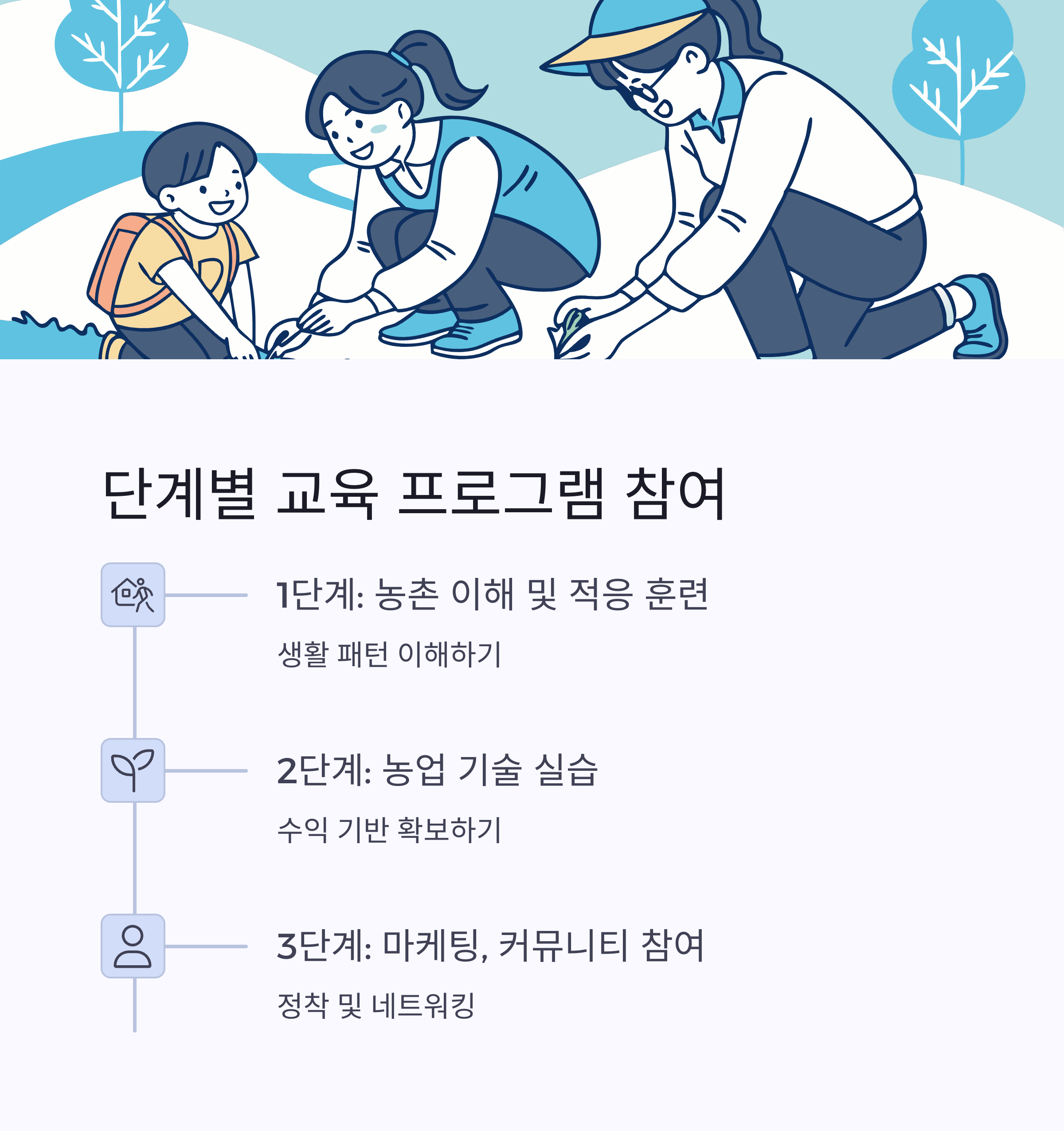| 1단계 | 농촌 이해 및 적응 훈련 | 생활 패턴 이해 |