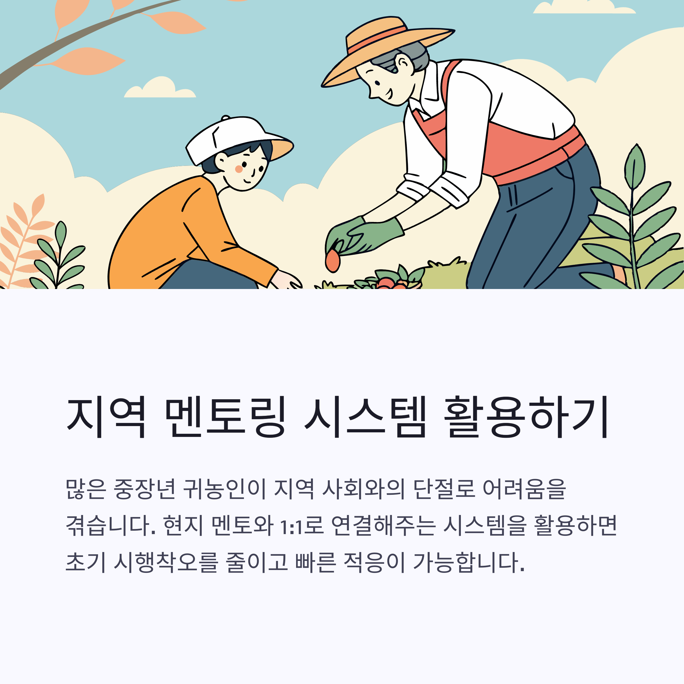 중장년층에게 맞는 연착륙 프로그램은 단계별 농업·정착 교육을 중심으로 구성되어야 합니다.