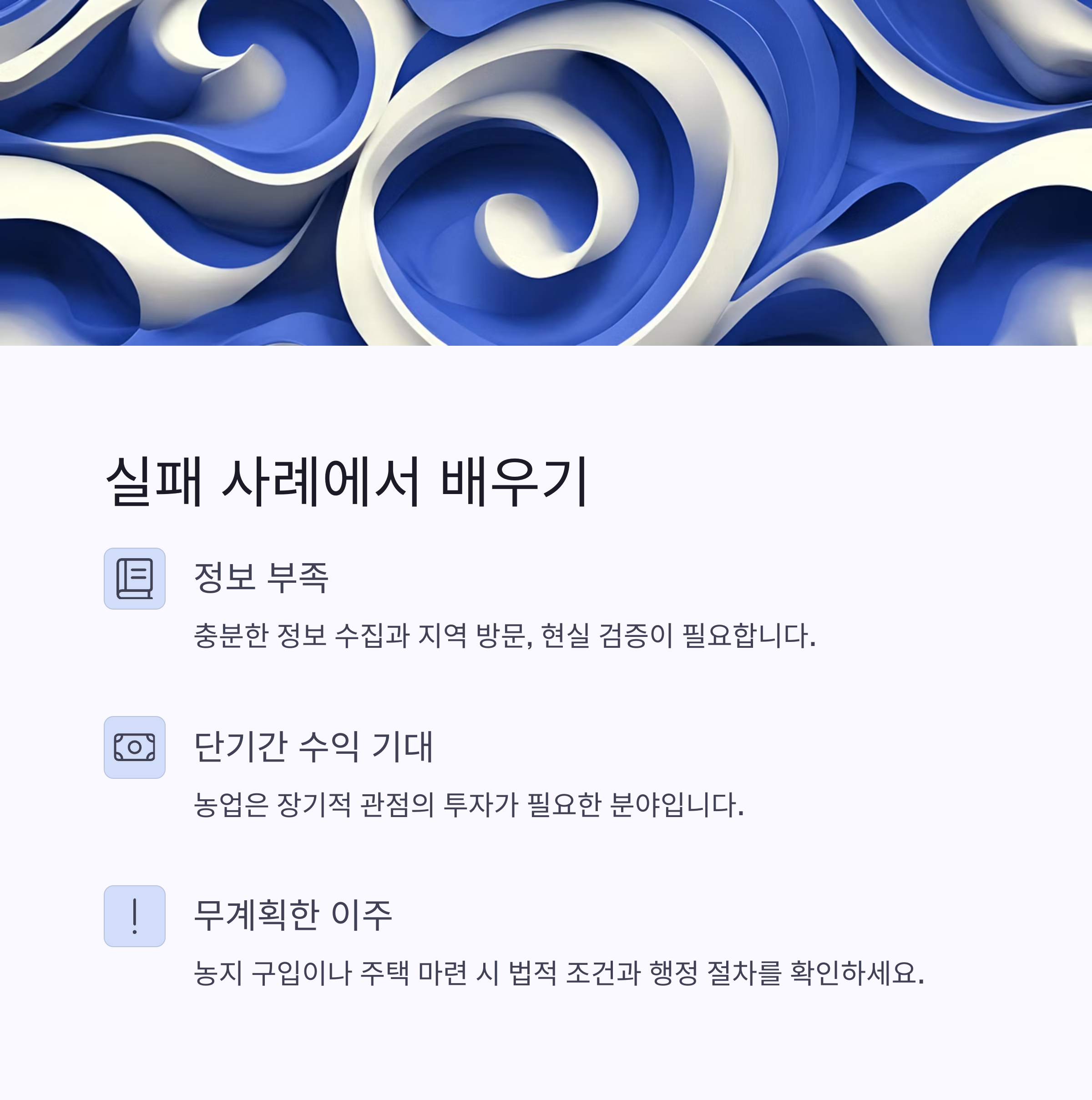 "정보 부족", "단기간 수익 기대", "무계획한 이주" 등이 그것입니다.