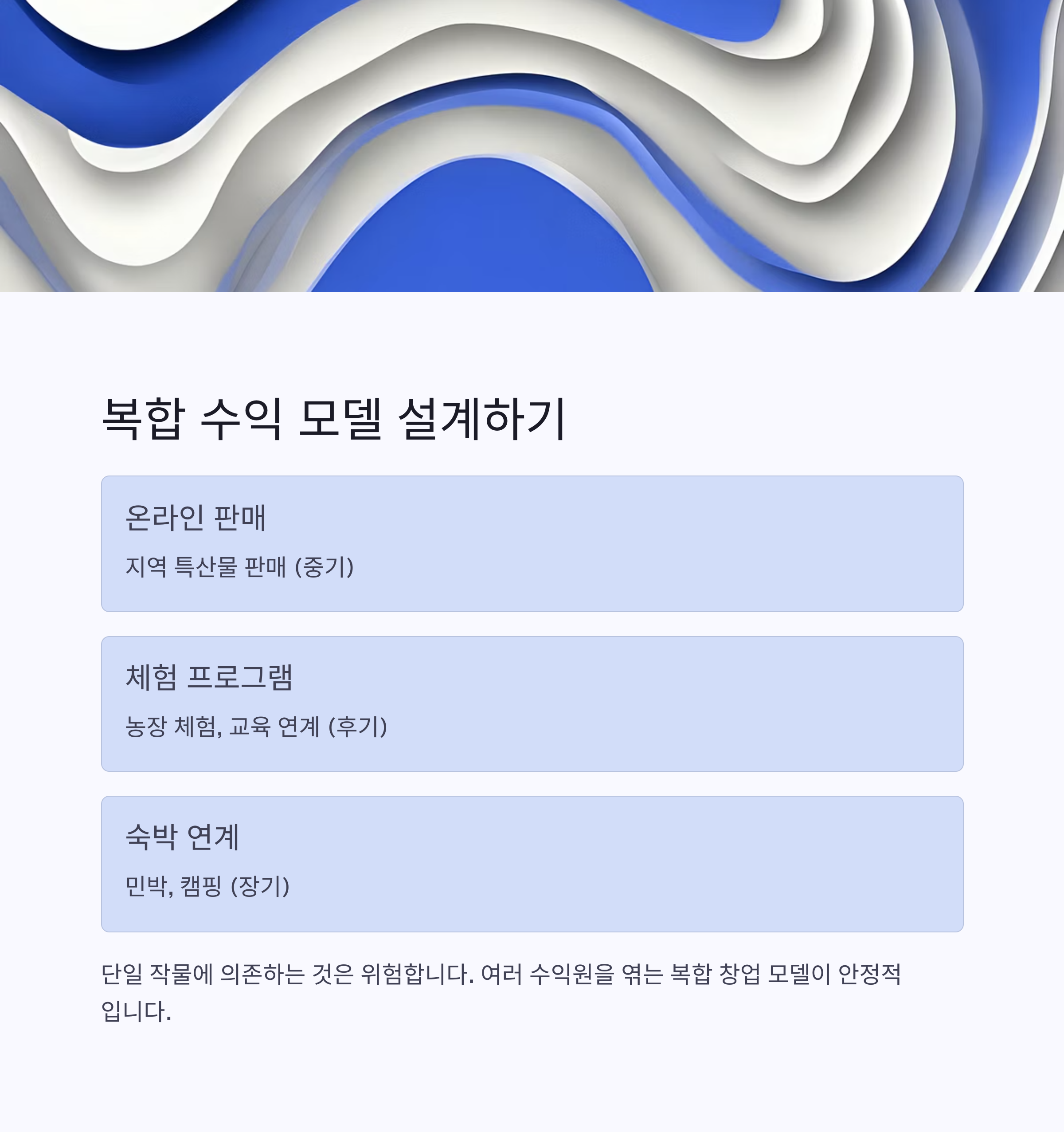 온라인 판매, 농촌 체험관 운영, 농가민박 등 부수 수익 모델을 병행 설계해야 합니다.