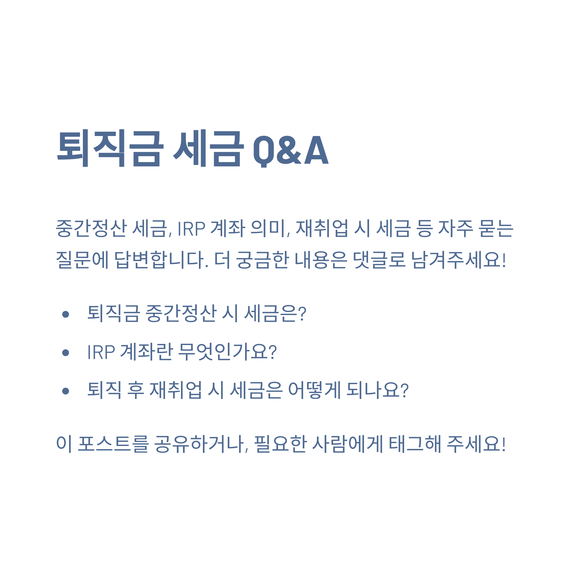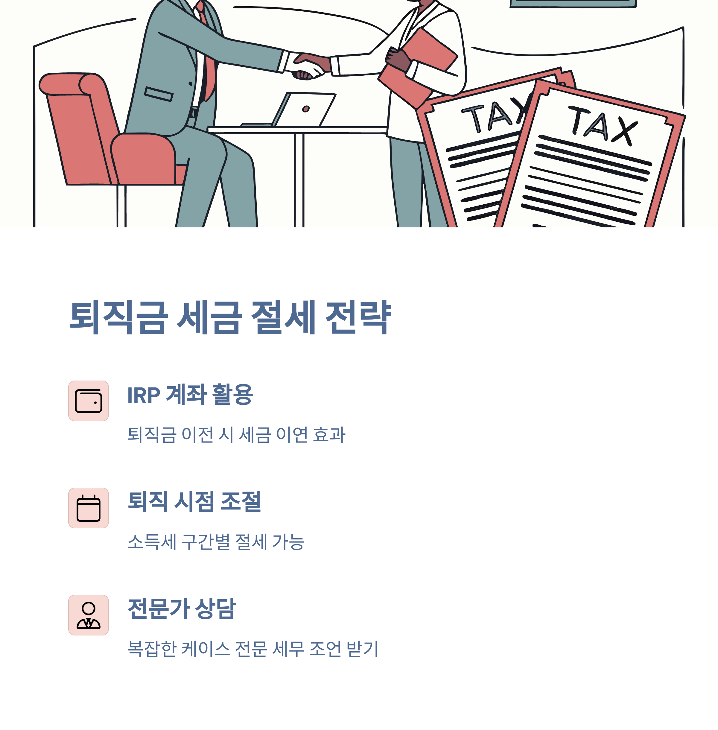 - 퇴직금 IRP로 이체 → 세금 이연 + 저율 연금소득세 적용