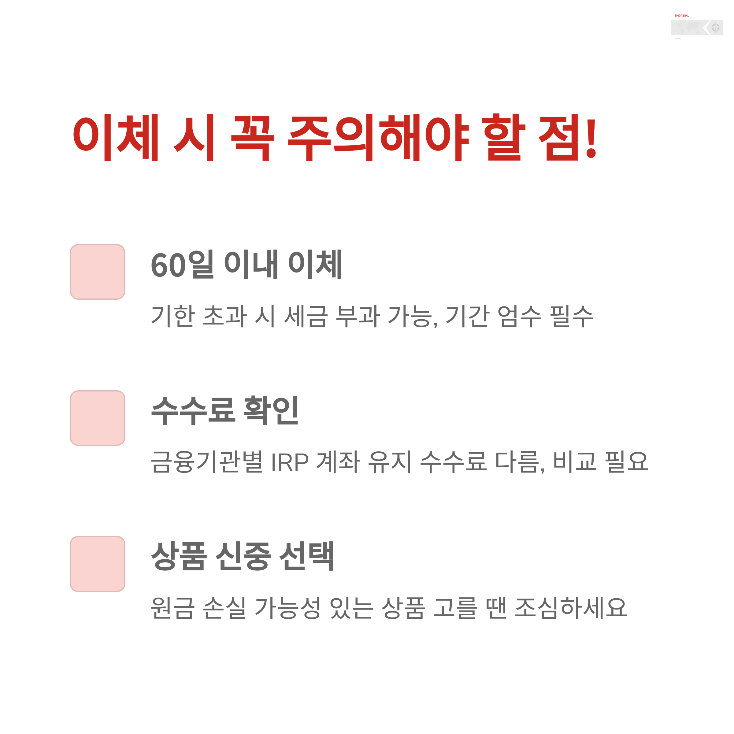 - IRP로 이체하면 퇴직소득세 이연 가능 (55세 이후 연금수령 시 저율 과세)