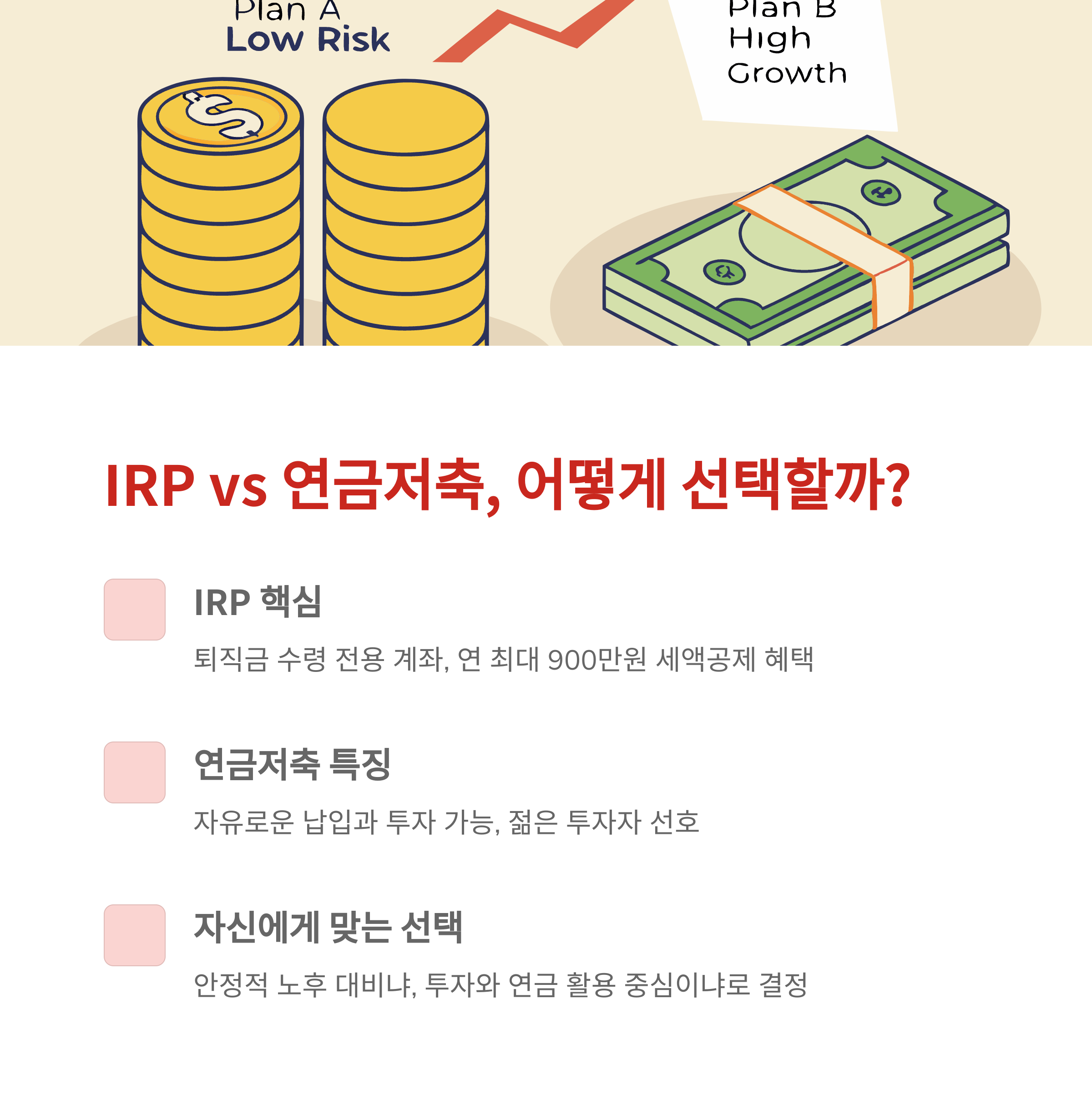 - IRP(개인형퇴직연금): 퇴직금 수령 전용 계좌, 투자상품 다양
