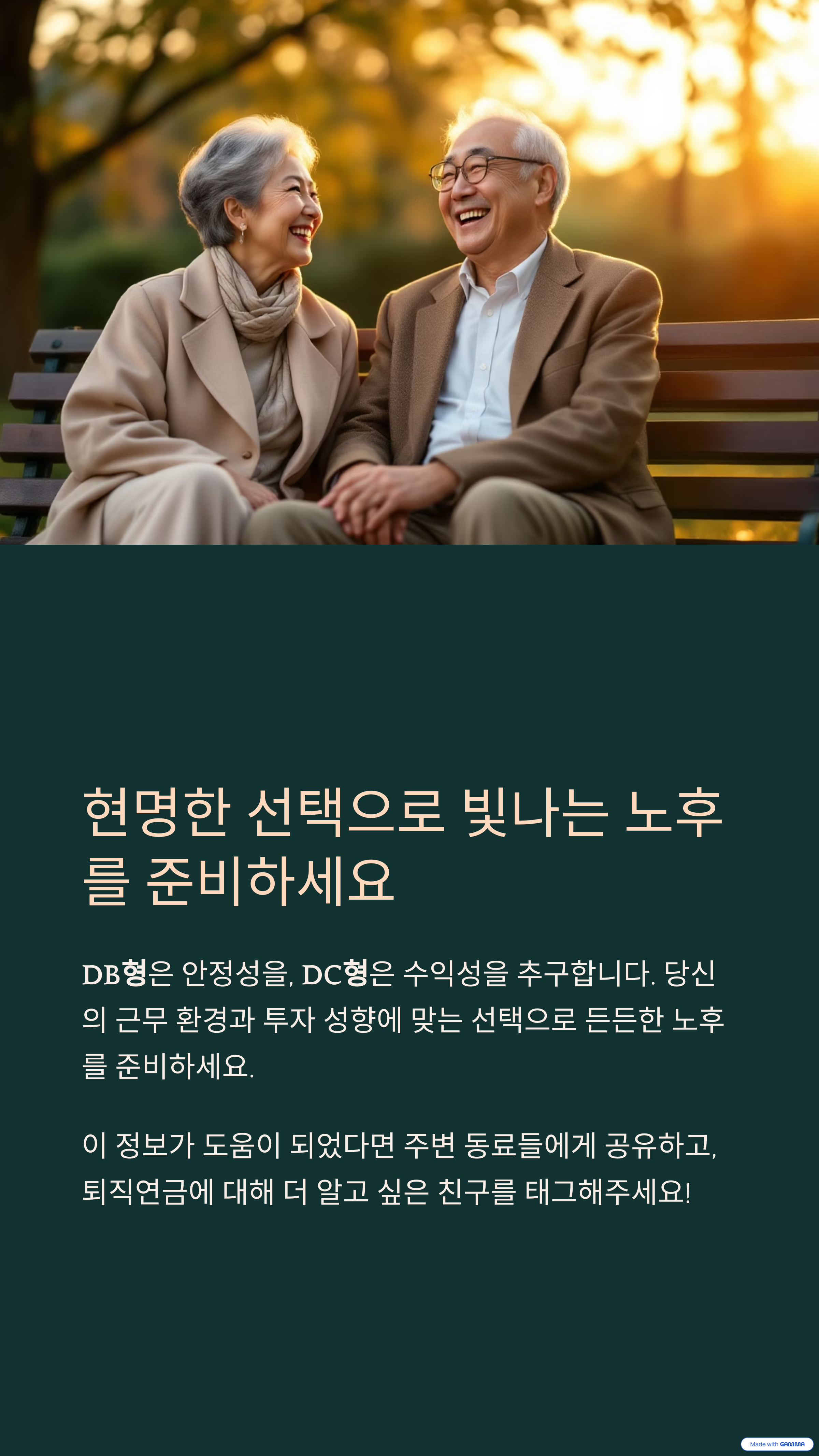 노후 생활의 안정성을 중시한다면 DB형, 성장 가능성을 기대한다면 DC형을 선택해야 합니다.