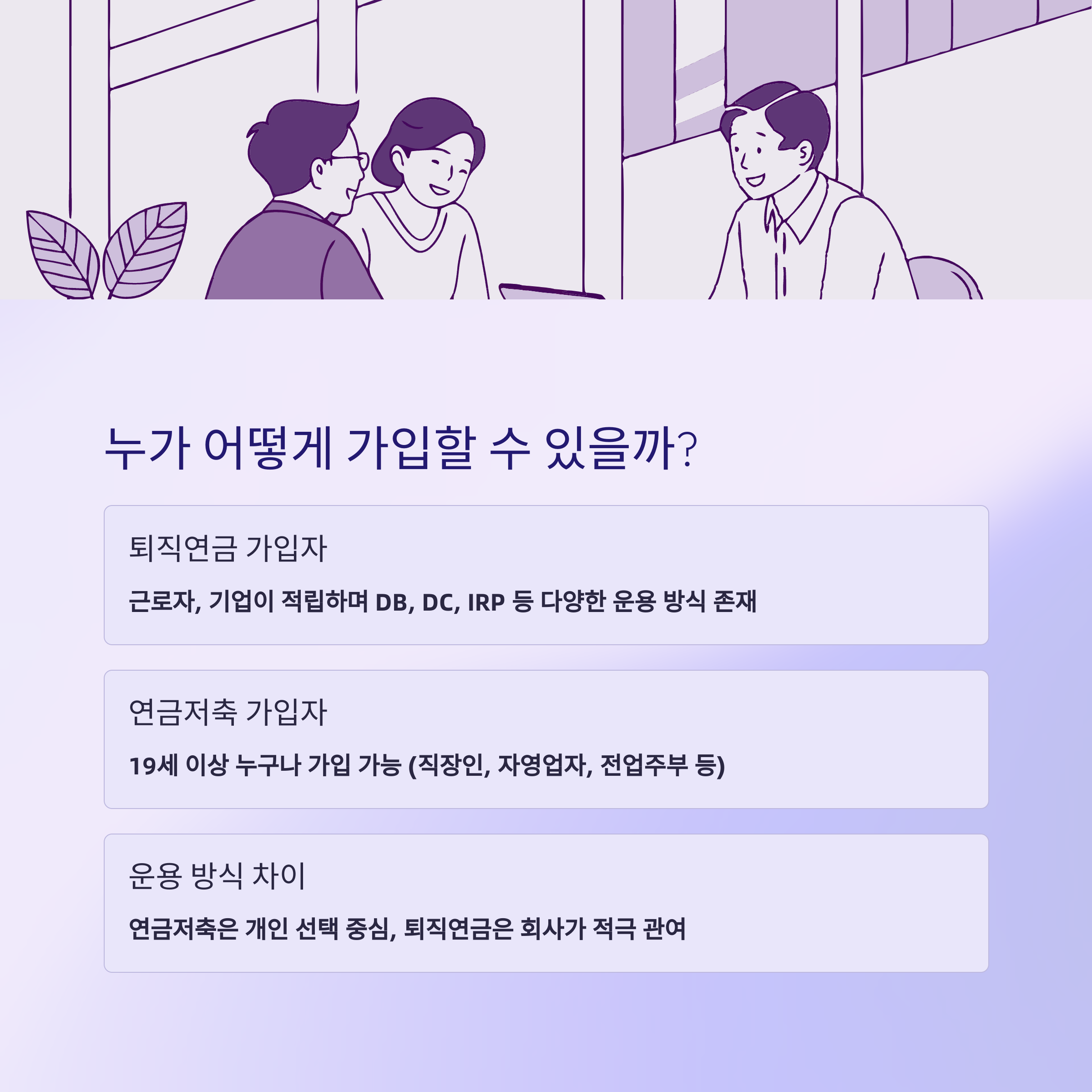 - 퇴직연금: 모든 근로자 대상, 회사가 가입 주체