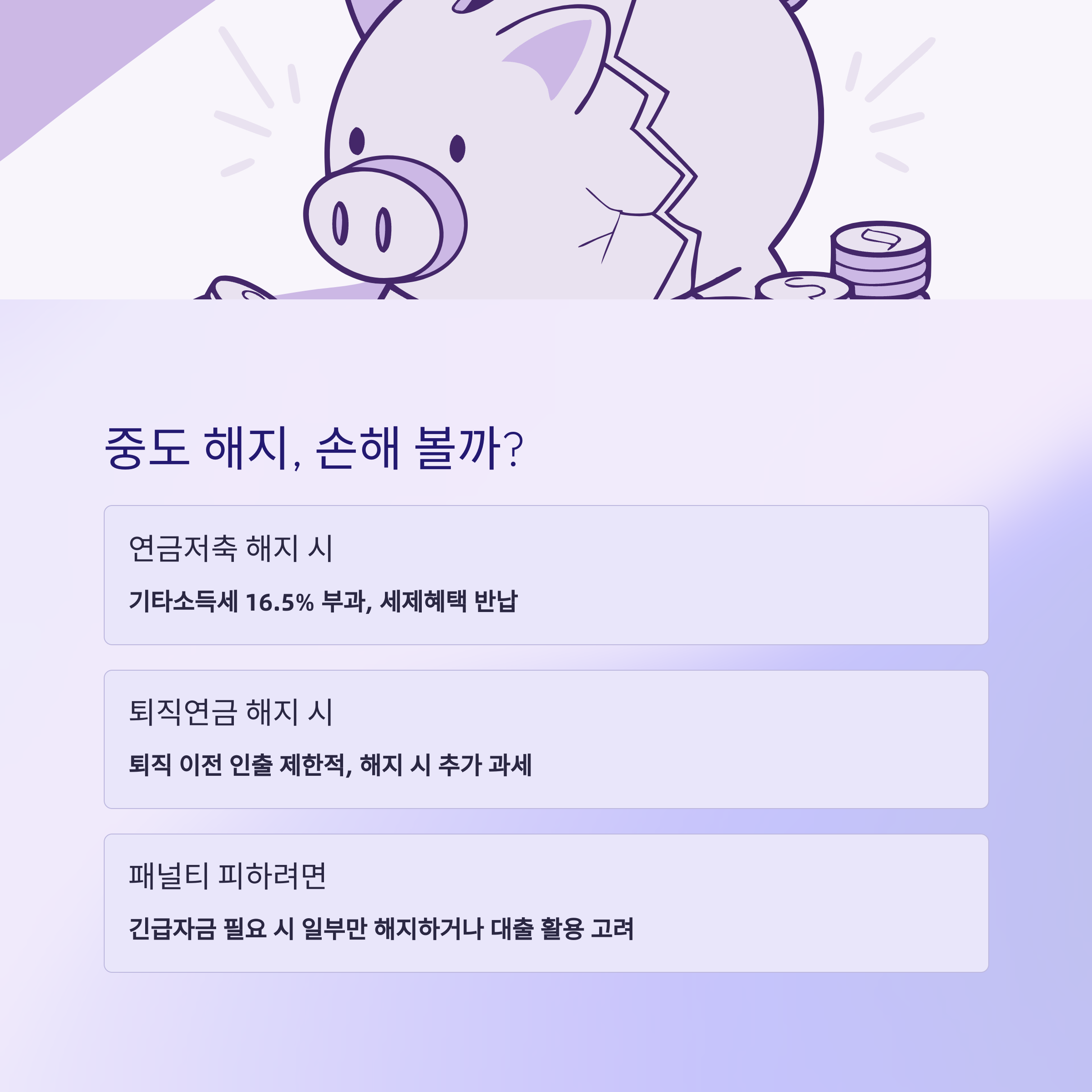 - 연금저축: 중도 해지 시 16.5% 세금+수수료 부담