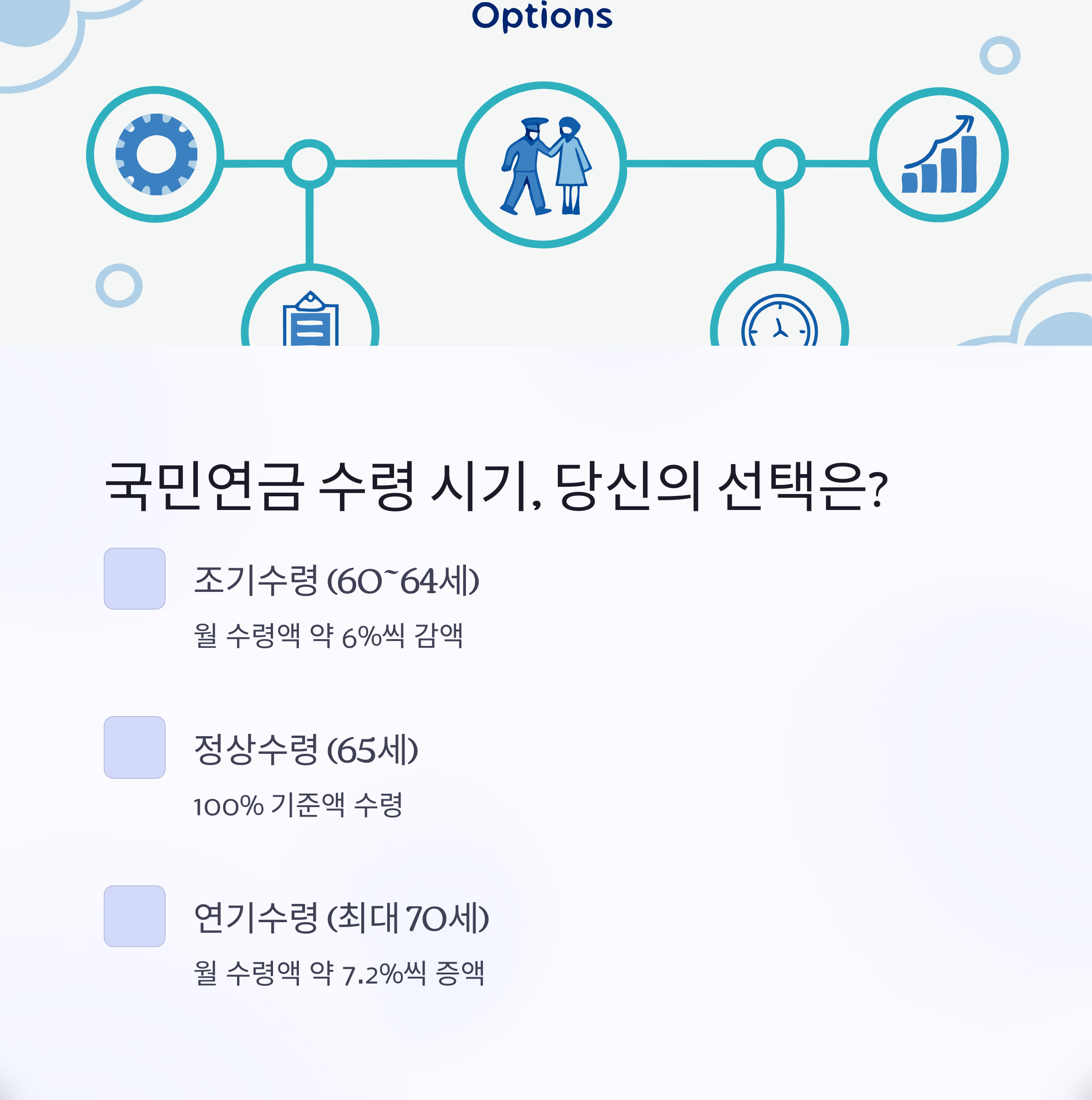 국민연금은 **조기수령(만 60세~64세)**과 연기수령(최대 만 70세) 두 가지 옵션이 있습니다.