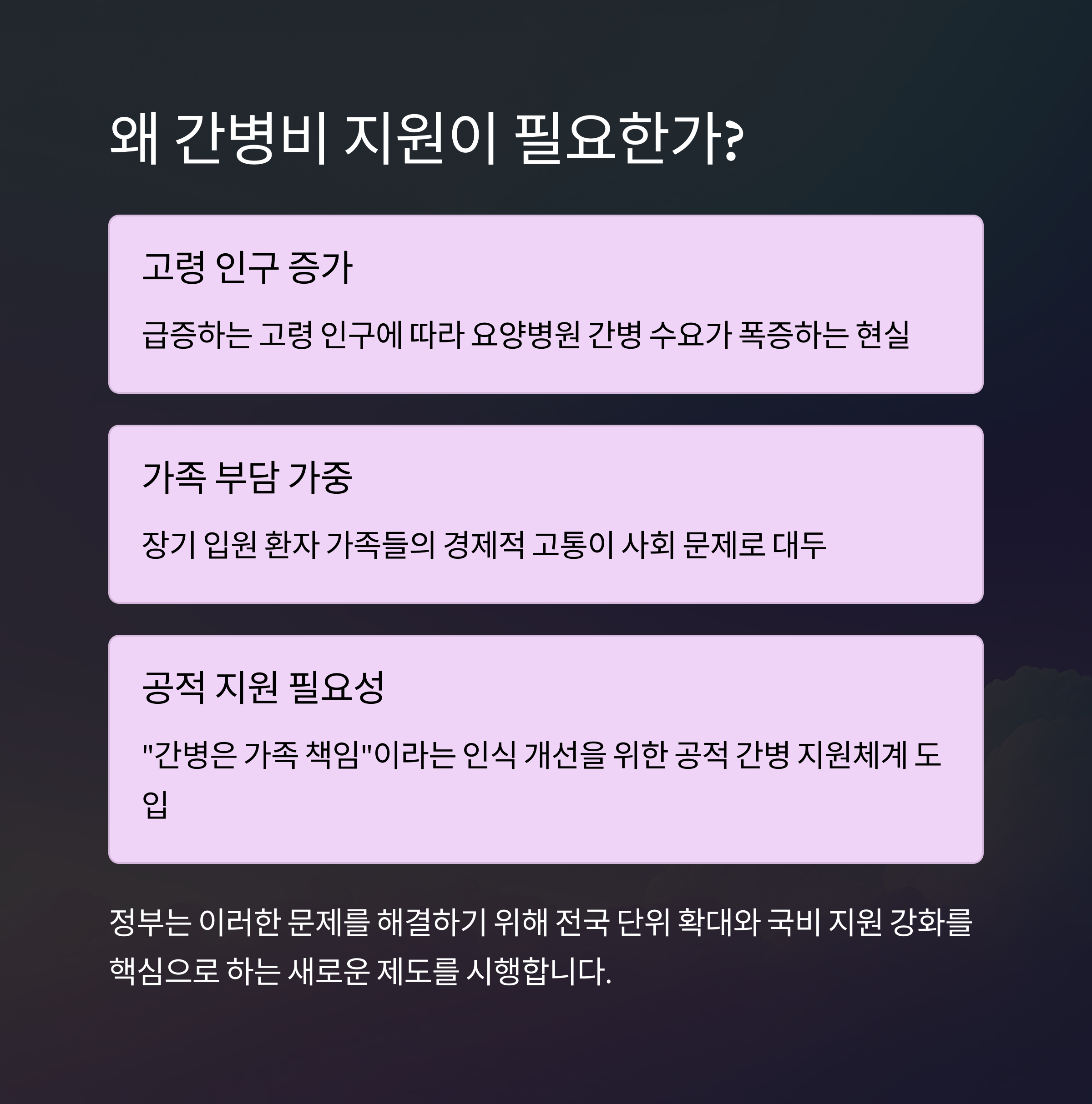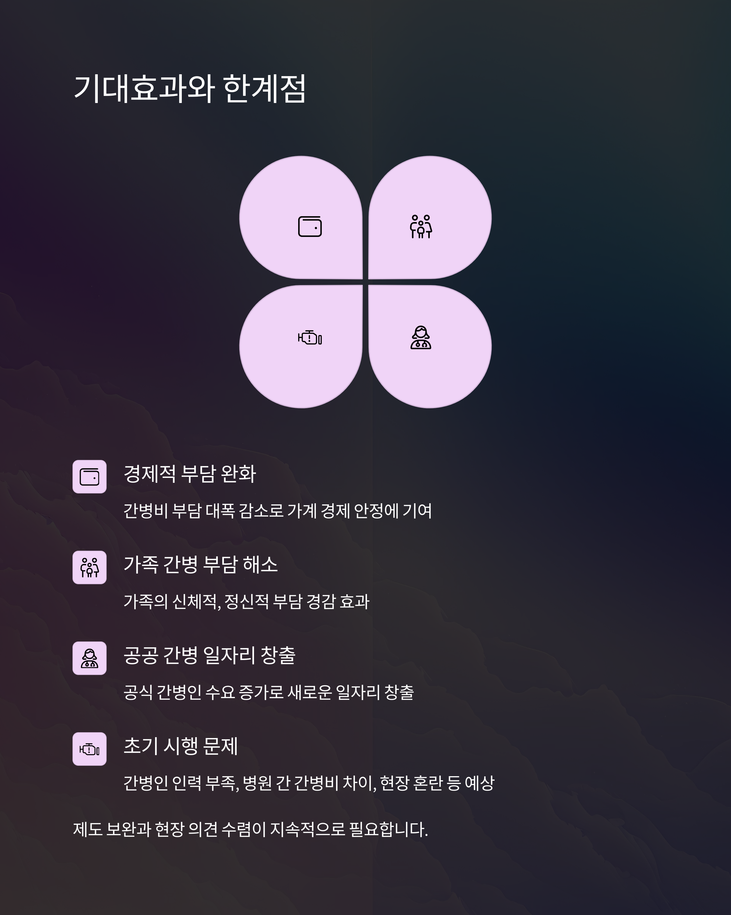 기존에는 개인 부담이 컸던 간병비를 공적 지원 체계로 흡수하려는 정책으로, 특히 중증환자·노인환자의 경제적 어려움을 덜어줄 수 있습니다.