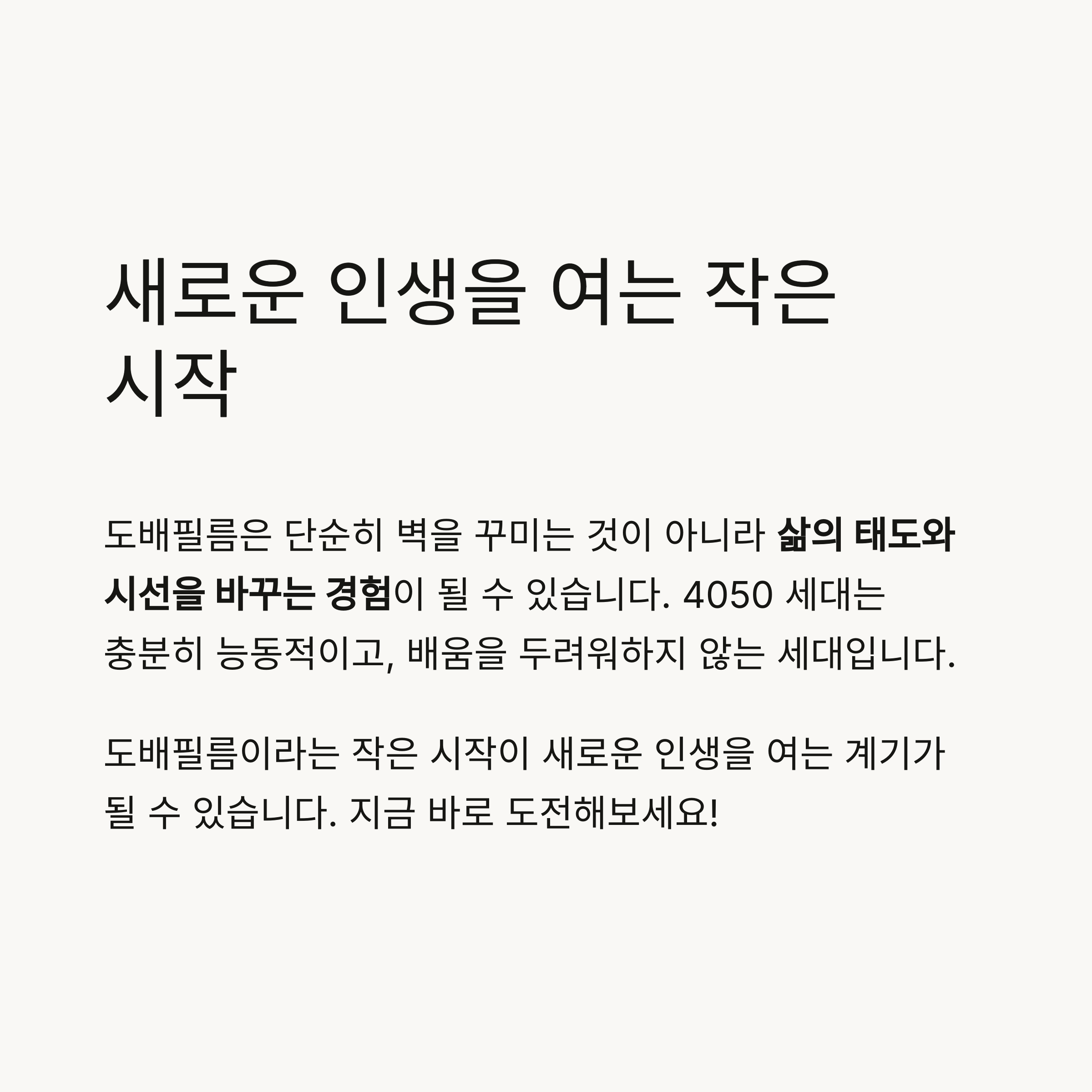 도배필름이라는 작은 시작이 새로운 인생을 여는 계기가 될 수 있습니다.