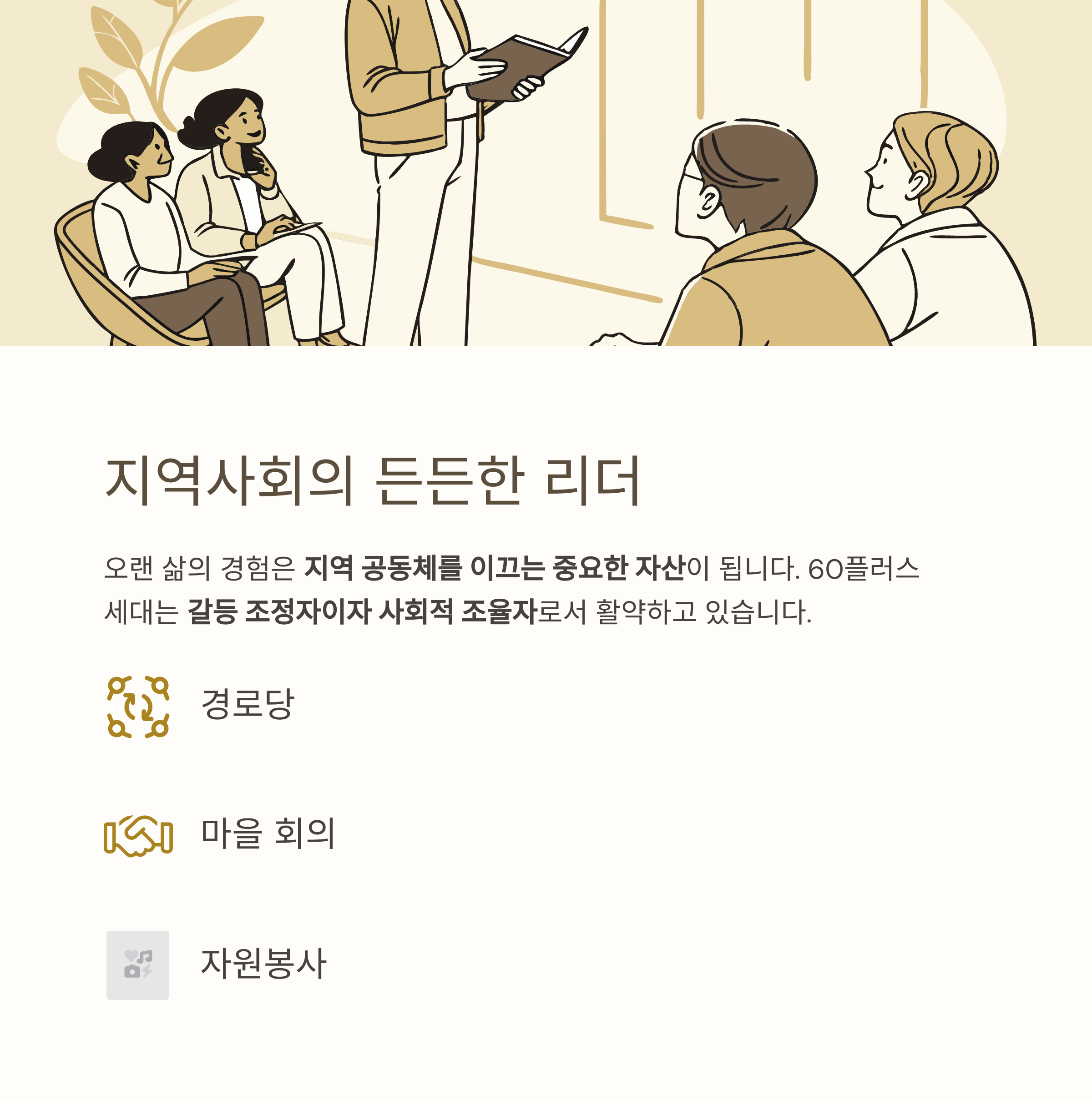60플러스 세대는 갈등 조정자이자 사회적 조율자로서 활약 중입니다.