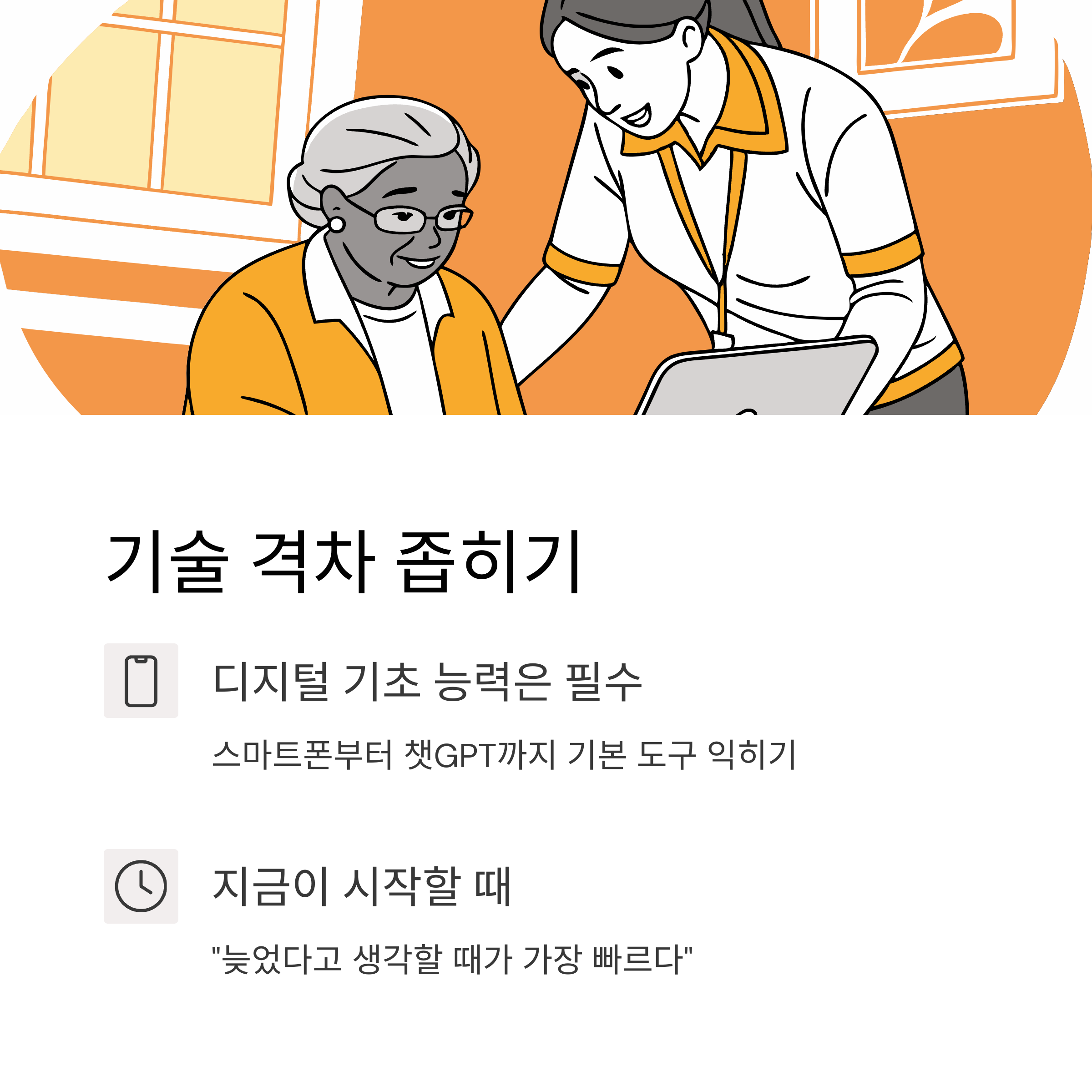 간단한 스마트폰 활용부터 챗GPT 같은 도구 사용까지 익혀야 기술 격차를 줄일 수 있습니다.